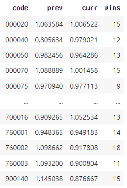 주가 등락 비율은 (기간 말의 주가 / 기간 초의 주가)로 계산하여 기간 초의 주가대비 비율을 나타낸다. wins 항목은 주가가 상승한 일수로 거래 정지 등의 이유로 주가가 정체된 경우를 필터링하고, 주가 변동성이 얼마나 컷는지 나타내는 지표로 사용할 수 있다. 예를 들어 같은 주가 상승 비율을 가졌을 때, wins 값이 높다면 변동성이 작다고 할 수 있다. (변동성 정보는 이번 자료에서는 사용하지 않았다)