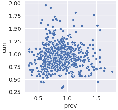 왼쪽부터 차례대로 30, 125, 250거래일의 주가 등락 정보를 가지고 과거 (prev) -> 미래 (curr) 가격 비율을 보여주는 분산 그래프이다. 그림에서 보는 것처럼 육안으로는 과거의 주가가 올랐든 내렸든 미래의 주가가 영향을 받는 것처럼 보이지는 않는다. 떨어지는 칼날 이론이 맞다면 전체적인 그림은 우하향 모양을 보였을 것이고, 달리는 말에타기 이론이 맞다면 우상향 모습이 그려졌어야 할 것이다. 이전 실험에서와 마찬가지로 최대 1년의 기간을 잡아도 과거의 주가가 미래의 주가에 영향을 미치는 경향은 찾기 힘든데, 우리는 칼날과 달리는 말을 계속 믿어도 되는걸까.