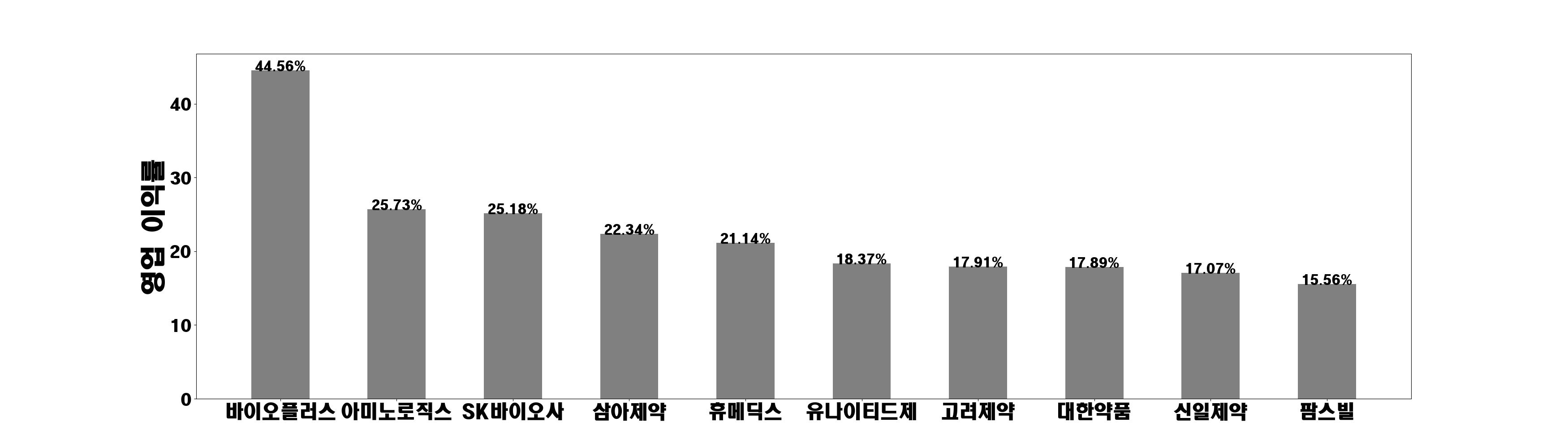 동화약품, 유한양행, 유유제약, 일동홀딩스, 삼일제약, 동아쏘시오홀, JW중외제약, 삼성제약, 종근당홀딩스, 동성제약, 한독, 제일파마홀딩, 국제약품, 부광약품, 에이프로젠바, 대웅, 일성신약, 대원제약, 영진약품, 보령, 현대약품, 팜젠사이언스, 녹십자홀딩스, 삼진제약, 녹십자, 에이프로젠, 일양약품, 서흥, 한미사이언스, 광동제약, 한올바이오파, 환인제약, 명문제약, 신풍제약, 유나이티드제, 종근당바이오, 대웅제약, JW홀딩스, 이연제약, 한미약품, 동아에스티, 종근당, 경보제약, JW생명과학, 일동제약, 제일약품, 하나제약, SK바이오사, SK바이오팜, 프레스티지바, 삼천당제약, 안국약품, 신신제약, 동구바이오제, 진양제약, 삼아제약, 경동제약, 신일제약, 고려제약, 우진비앤지, 서울제약, 대한약품, HLB, 한국파마, 조아제약, 대성미생물, 에스텍파마, 코미팜, 블레이드 E, 이글벳, HLB제약, 제일바이오, 바이넥스, 경남제약, 대한뉴팜, CMG제약, 씨티씨바이오, 화일약품, 안트로젠, 테라젠이텍스, 대화제약, JW신약, 셀트리온제약, 중앙백신, 제넨바이오, 아미노로직스, 대봉엘에스, 한국유니온제, 비보존 제약, 휴온스글로벌, 진바이오텍, 동국제약, 아미코젠, 바이오플러스, 코오롱생명과, 하이텍팜, 에이프로젠 , 그린생명과학, 큐리언트, 옵투스제약, 비엘, 옵티팜, 아이큐어, 애드바이오텍, 엔지켐생명과, 에이디엠코리, HK이노엔, 휴메딕스, 비씨월드제약, 에이비온, 지엘팜텍, 퓨쳐켐, 드림씨아이에, 녹십자웰빙, 메드팩토, 에스티팜, 휴온스, 모비스, 알리코제약, 차백신연구소, HLB바이오, 카이노스메드, 브릿지바이오, 압타바이오, 더블유에스아, 국전약품, 바이젠셀, 보로노이, 지놈앤컴퍼니, 알피바이오, 팜스빌, 티움바이오, 박셀바이오, 위더스제약, 프레스티지바, 씨엔알리서치, 큐라클, 디티앤씨알오, 인벤티지랩, 에이프릴바이, 네오이뮨텍