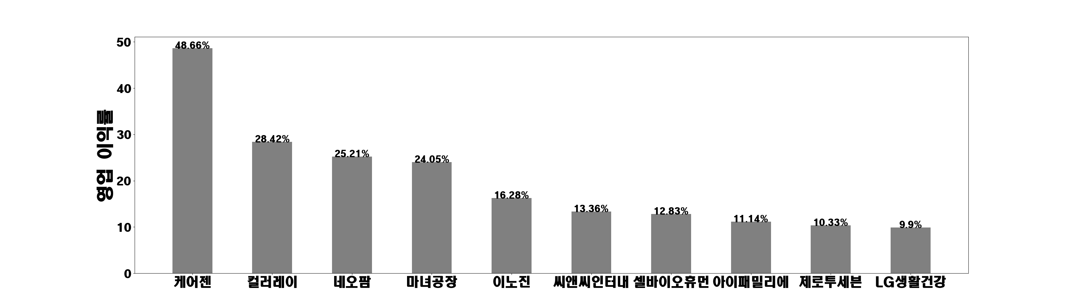 아모레G, 한국화장품제, 애경산업, 한국콜마홀딩, 제이준코스메, 비케이탑스, LG생활건강, 에이블씨엔씨, 메타랩스, 아모레퍼시픽, 한국화장품, 현대퓨처넷, 한국콜마, 코스맥스, 토니모리, 잇츠한불, 오가닉티코스, 컬러레이, 메디앙스, 브이티지엠피, 바른손, 글로본, 코리아나, 원익, 현대바이오, 현대바이오랜, 코스온, 코디, 코스나인, CSA 코스, 선진뷰티사이, 네오팜, 아이패밀리에, 제닉, 제로투세븐, 스킨앤스킨, 내츄럴엔도텍, 프로스테믹스, 라파스, 케어젠, 에스디생명공, 디와이디, 케이엠제약, 본느, 아우딘퓨쳐스, 클리오, 코스메카코리, 올리패스, 세화피앤씨, 씨티케이, 엔에프씨, TS트릴리온, 셀바이오휴먼, 이노진, 씨앤씨인터내, 마녀공장, 잉글우드랩