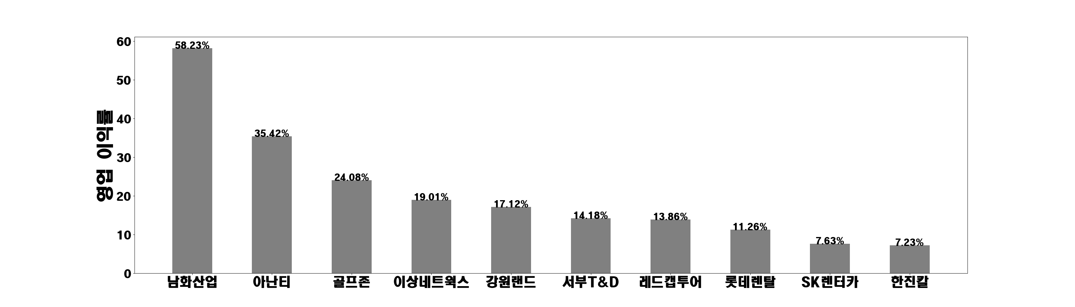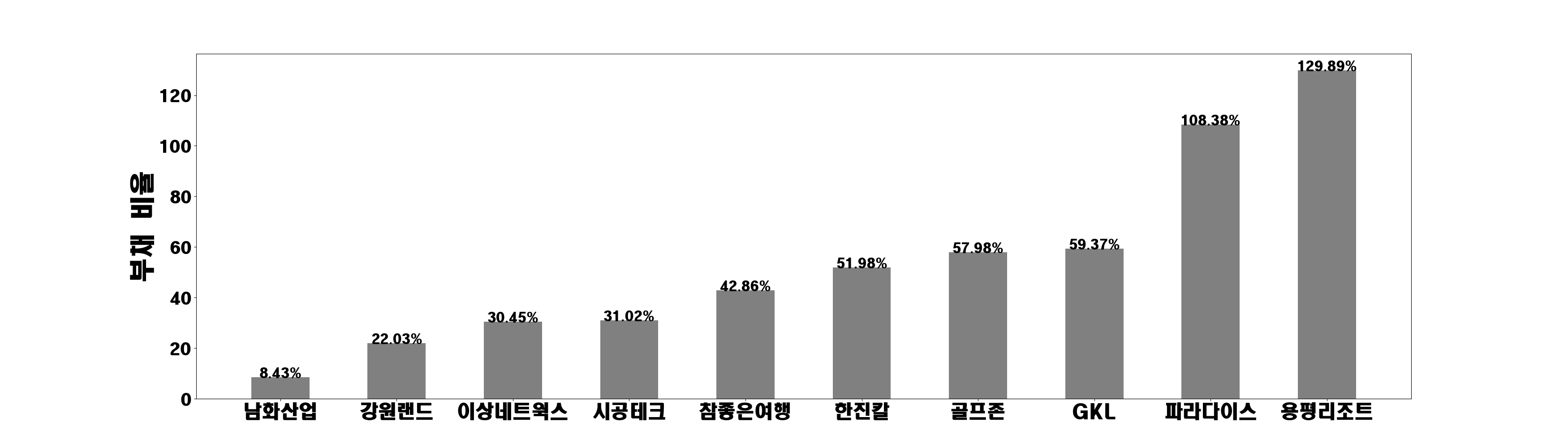 롯데관광개발, 강원랜드, 하나투어, SK렌터카, 용평리조트, 롯데렌탈, GKL, 한진칼, 쏘카, 서부T&D, 시공테크, 아난티, 파라다이스, 레드캡투어, 이상네트웍스, 모두투어, 참좋은여행, 노랑풍선, 남화산업, 골프존, 디딤이앤에프